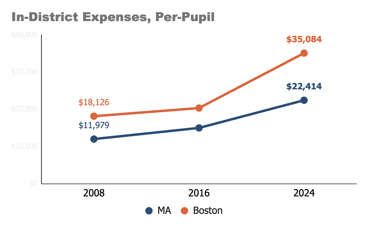 Public school spending nearly doubled (unadjusted for inflation) in Massachusetts and Boston during this time.