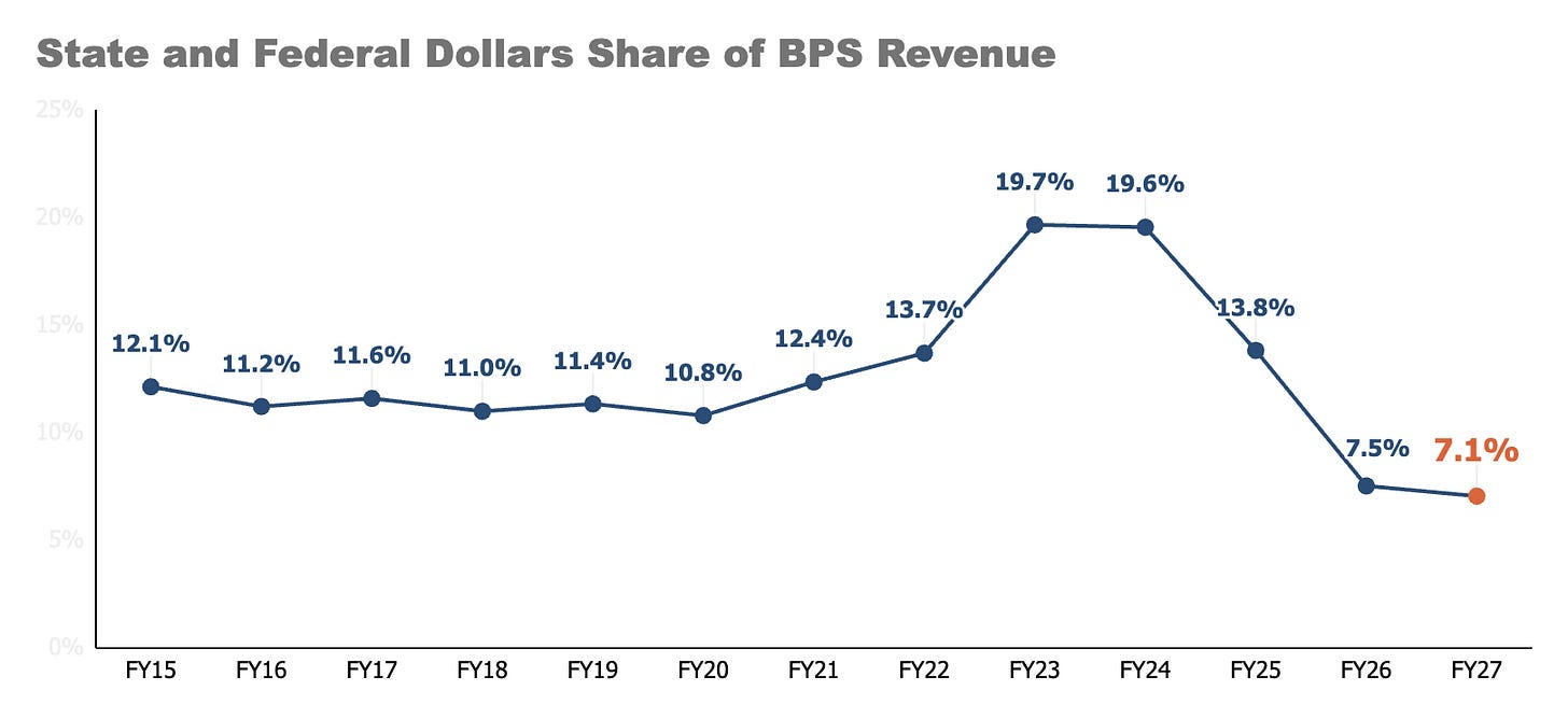 No, it is because BPS has fewer children. State and federal funding is formulaic, based on the number of kids in a district (and its demographics). Given that BPS has lost one out of eight pupils since 2019, it should be no surprise that state and federal funding - aside from stimulus years - has declined.