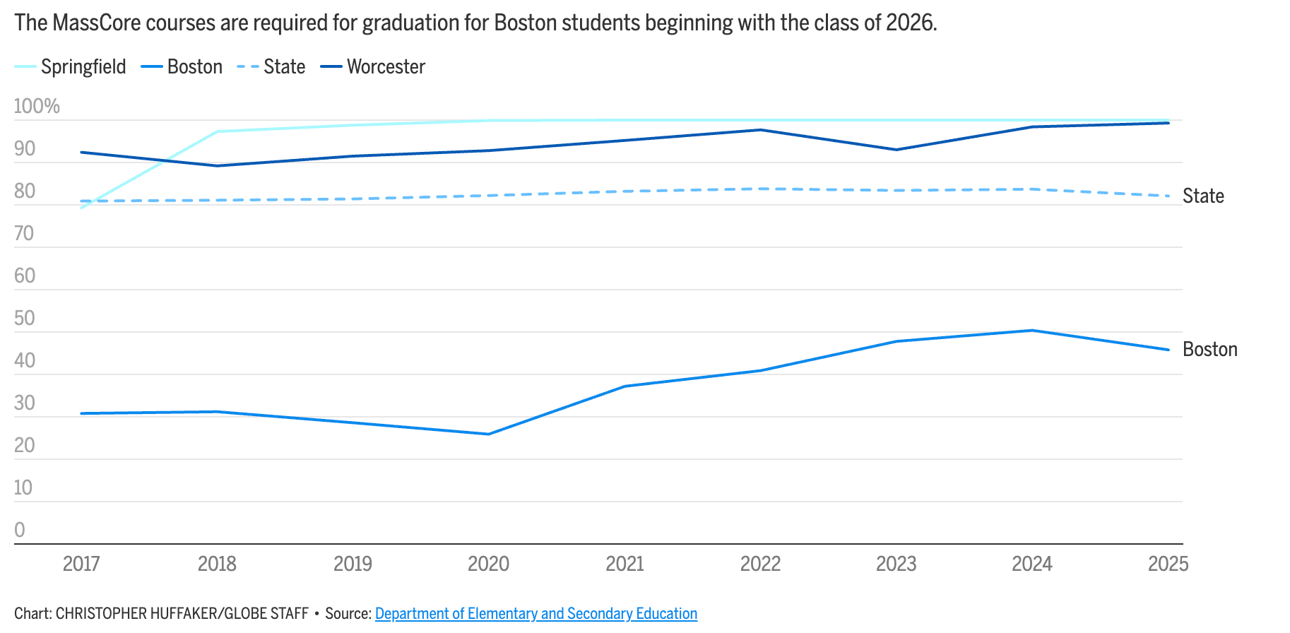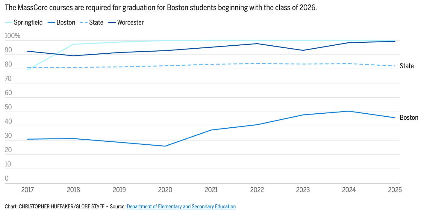 The initial budget presentation was not the only topic of Wednesday’s Boston School Committee (materials here). The district’s long, winding road to adopting MassCore - a state-recommended coursework for college and career readiness - will continue. Faced with 1 out of 3 BPS students possibly not qualifying for graduation, the requirement will be waived.