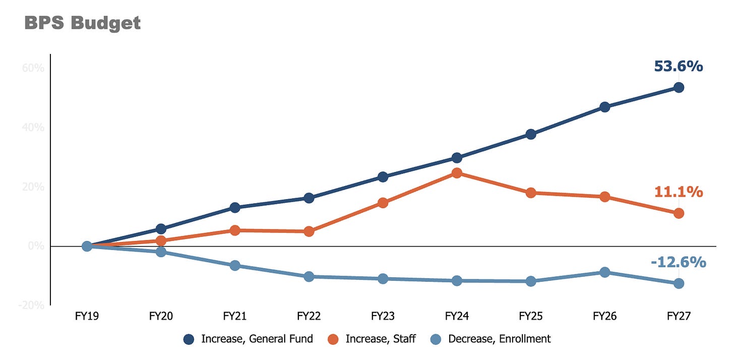Who picks up the balance? The city, which has increased its funding for BPS by +53% (not adjusted for inflation) since the pandemic. This revenue reality creates a trade-off: the overall city budget must keep increasing to keep pace, or pull money from police, fire, streets, parks or other city services to make BPS whole. Based on early budget communication, the former seems unlikely.