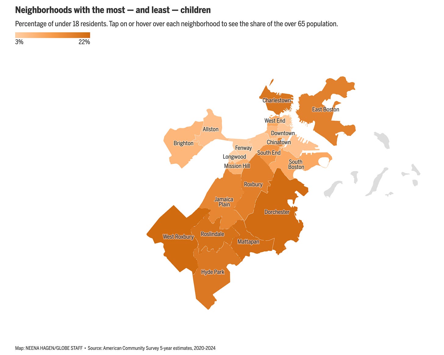 Lots of nuggets in the hovers. West Roxbury somehow has both the youngest and oldest population in the city: more than 4 in 10 residents are in school or at retirement age. Meanwhile, ~90% of Allston is aged 19-64. Despite being one of the smallest neighborhood populations, the Seaport has nearly as many high-wage earners as all of Mattapan. Etc.
