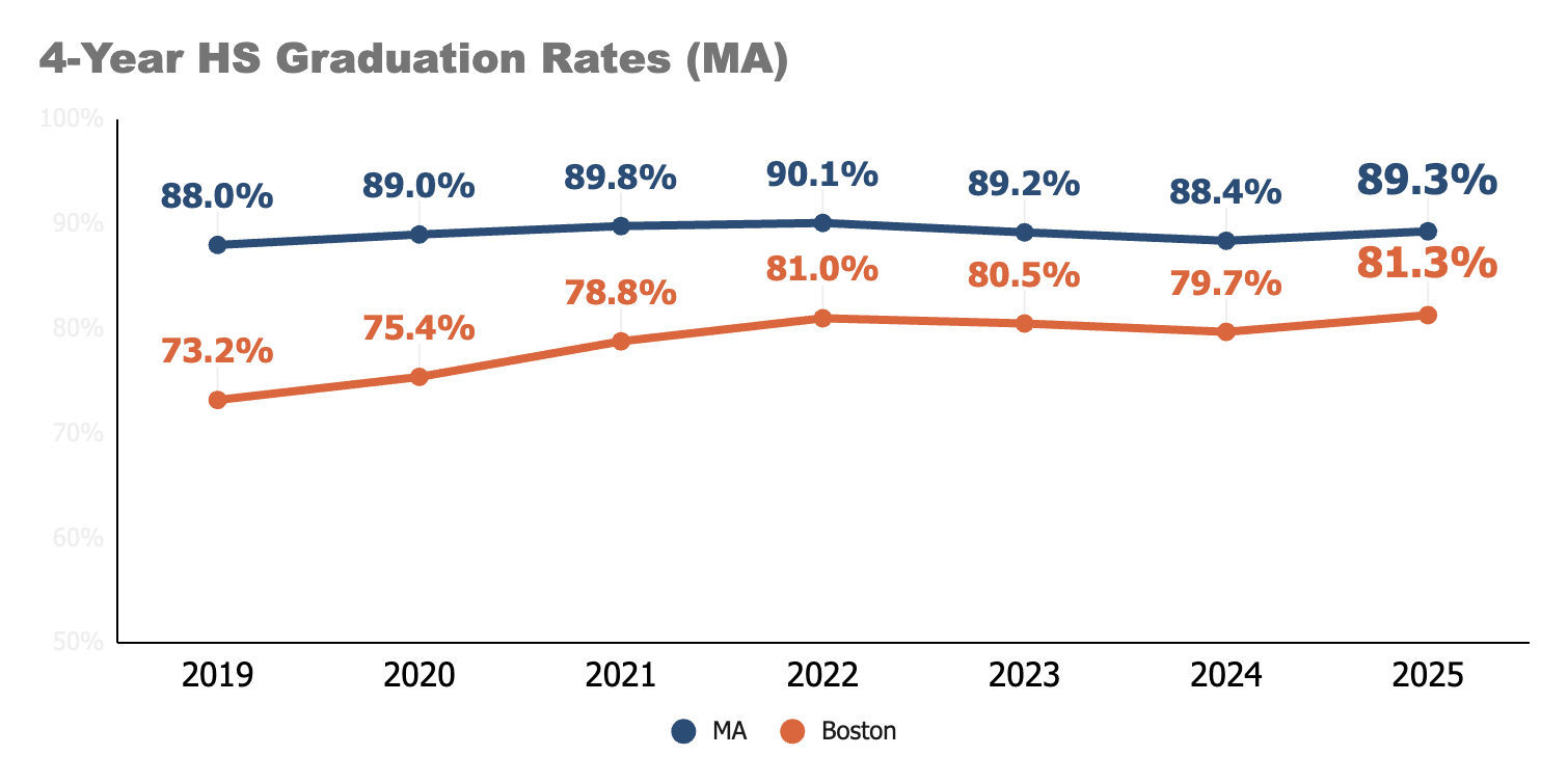 High school graduation data was updated last night. After two years of decline, Boston and MA rates rose in 2025. More to come on this.
