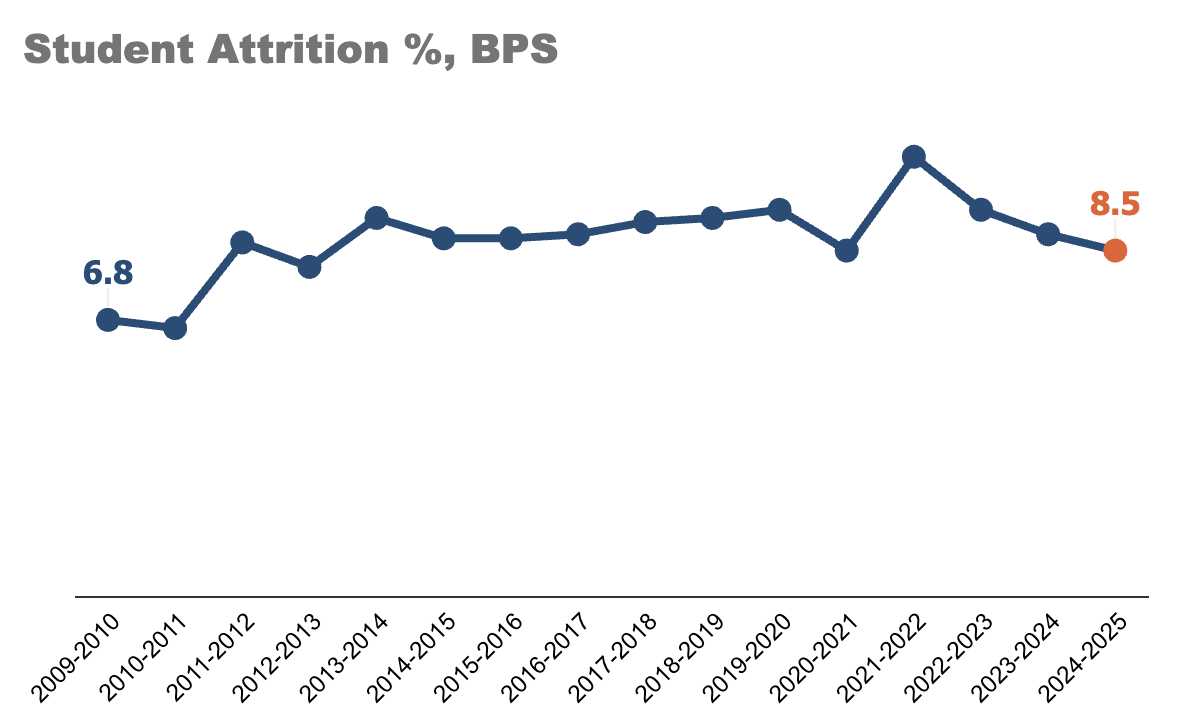 Scrolling through the most recently released data, Boston’s attrition aligns with other cities in Massachusetts, with some local color. After increasing nearly every year and through the pandemic, Boston’s attrition rates have begun to decline.