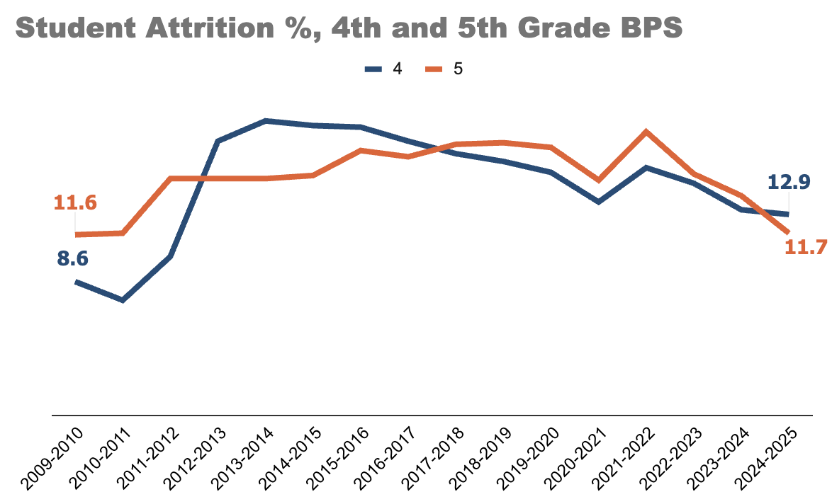 At the same time, attrition rates for Black students in these grades spiked; in some years in this span, one-quarter of all BPS Black students in these grades attritted.